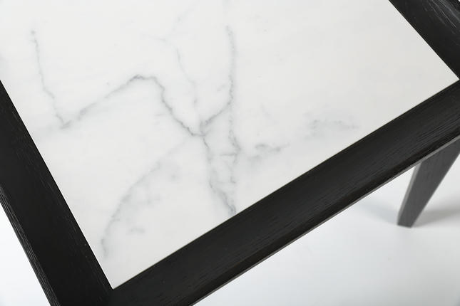 The central tray, crafted from Italian sintered stone, showcases natural textures alongside the solid wood, creating a timeless and stylish combination.
