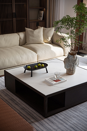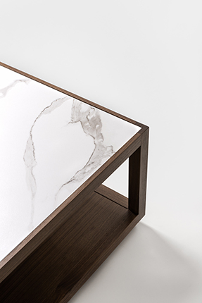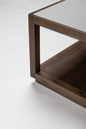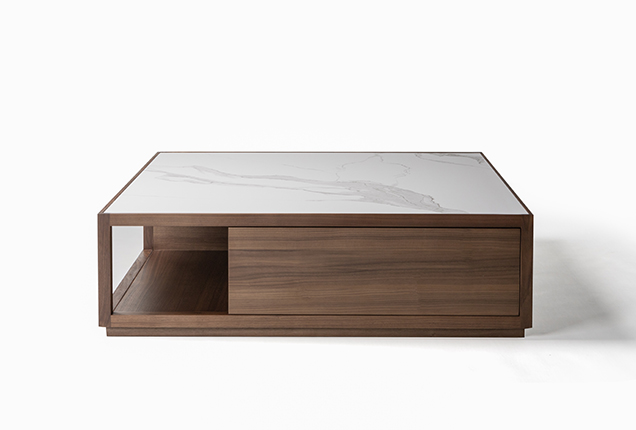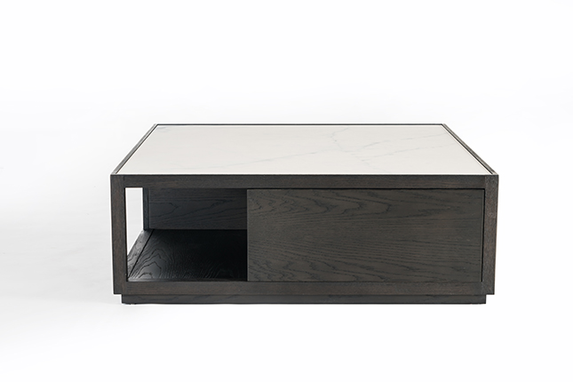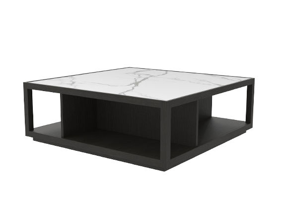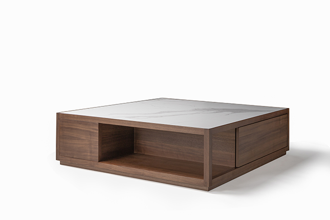 The hollowed-out design introduces an interplay of geometric volumes, lending an ethereal elegance to the substantial form of the plane wood coffee table.