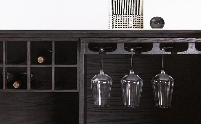 The upper section appears as a simple, four-panel cabinet, yet reveals a thoughtfully organized interior with dedicated racks for wine and glasses upon opening.