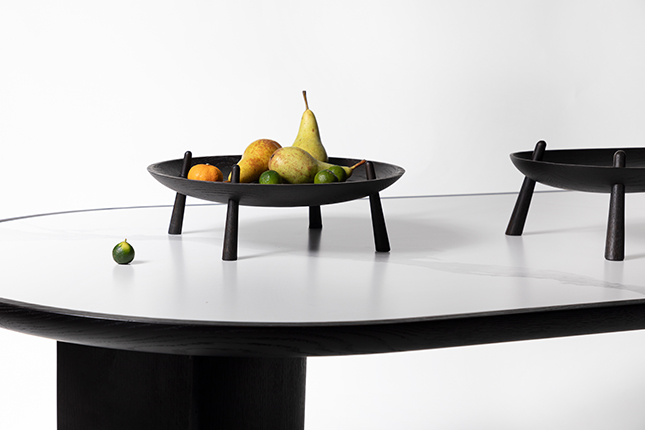 this fruit bowl features a minimalist mortise-and-tenon joint that seamlessly connects the bowl to its four legs.