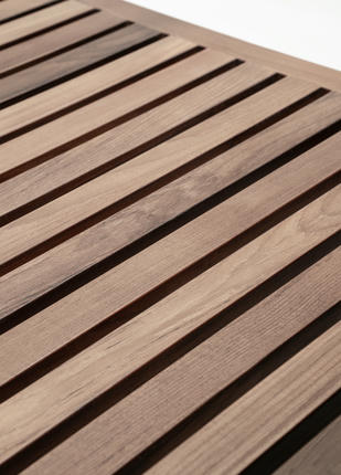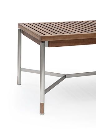 The warm tones of teak wood blend seamlessly with the cool elegance of metal, achieving a refined material transition at the crossrail.