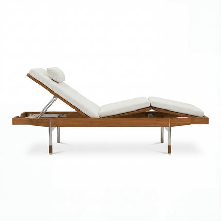 Crafted from teak and metal, the piece combines a lightweight form with a grounded, substantial presence.