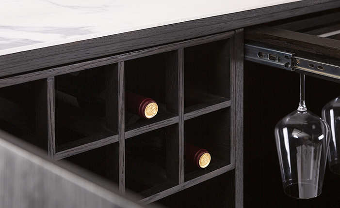 上方实木部分看似为最简单四平面柜,而打开内部后却另有乾坤,酒架、杯架一应俱全,