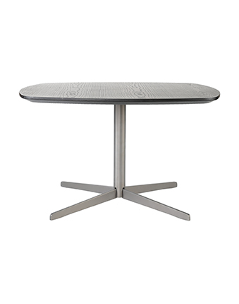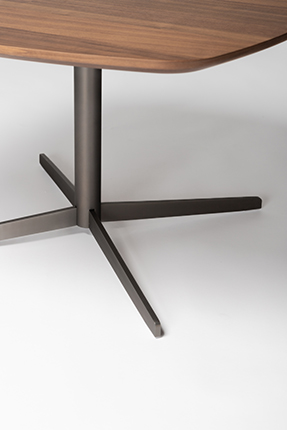 桌面展现细腻木纹肌理,金属底角从圆柱支脚中延伸而出,
