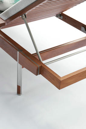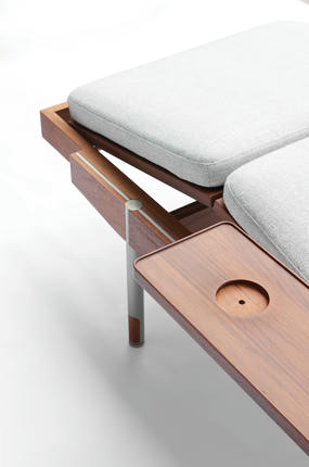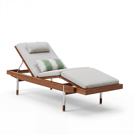 整体以柚木与金属构筑,形态轻盈而意蕴沉稳,