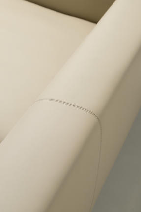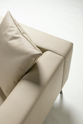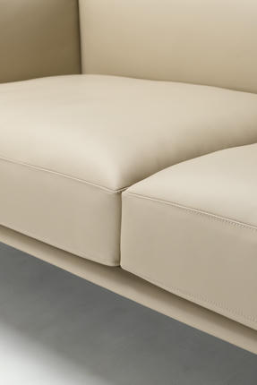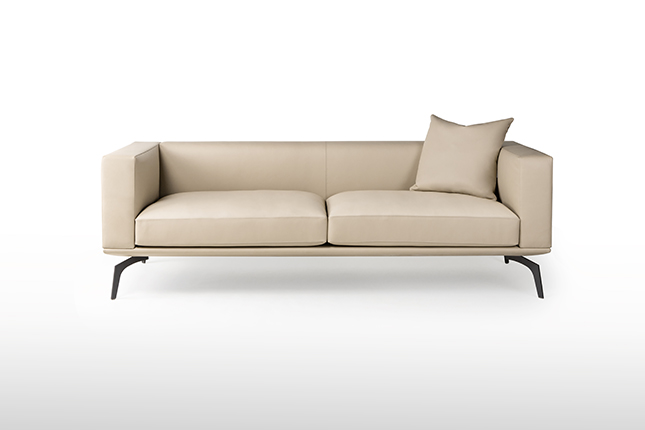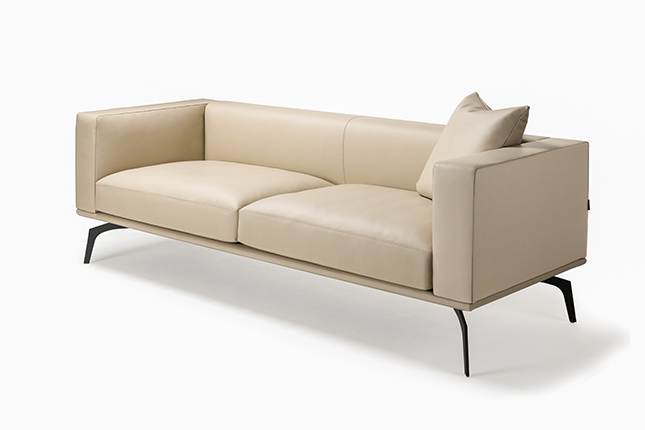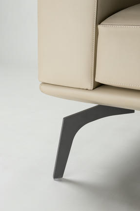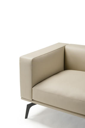 The modular silhouette, defined by rounded squares and clean external lines, is fully upholstered in supple genuine leather. It stands on distinctive metal feet, reminiscent of an agile creature's paws.