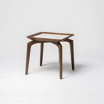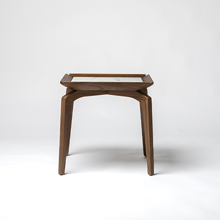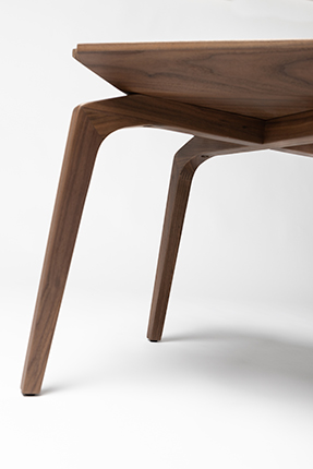 Featuring solid wood base legs and a square tabletop, the design is characterized by clean geometric angles with edges that extend outward and are slightly raised.