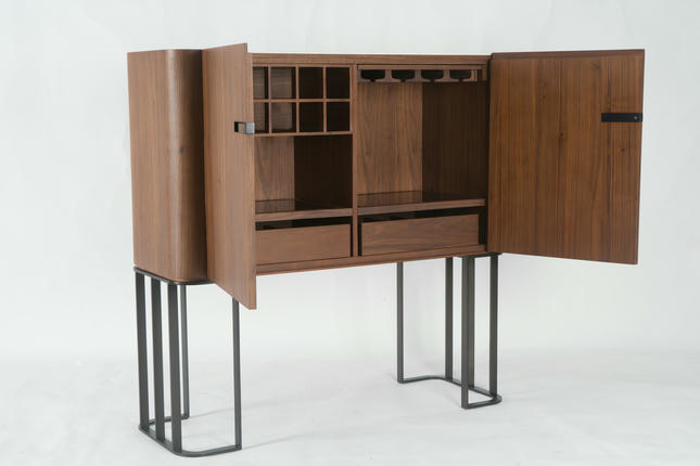 The upper section appears as a simple, four-panel cabinet, yet reveals a thoughtfully organized interior with dedicated racks for wine and glasses upon opening.