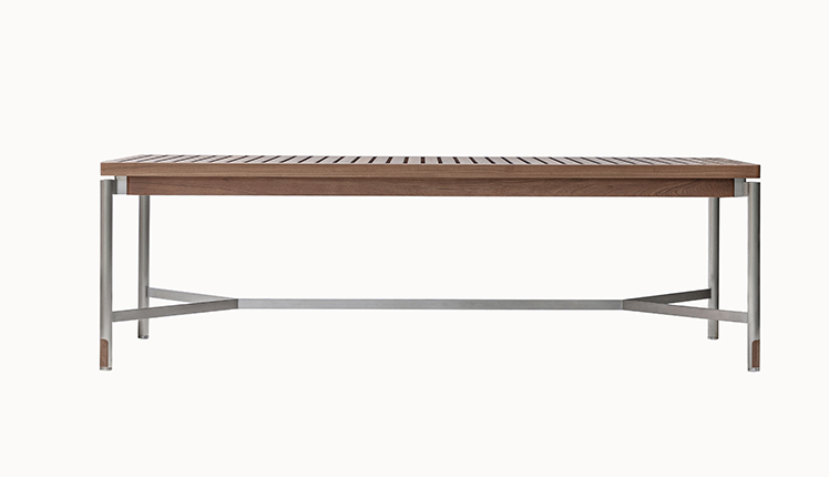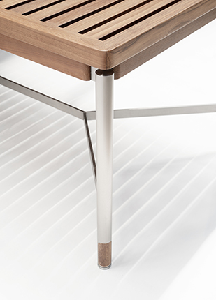 The warm tones of teak wood blend seamlessly with the cool elegance of metal, achieving a refined material transition at the crossrail.