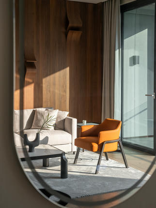 软包部分契合圈椅的半包围式,腿部框架采用榫卯结构并做了内圆的造型切削。